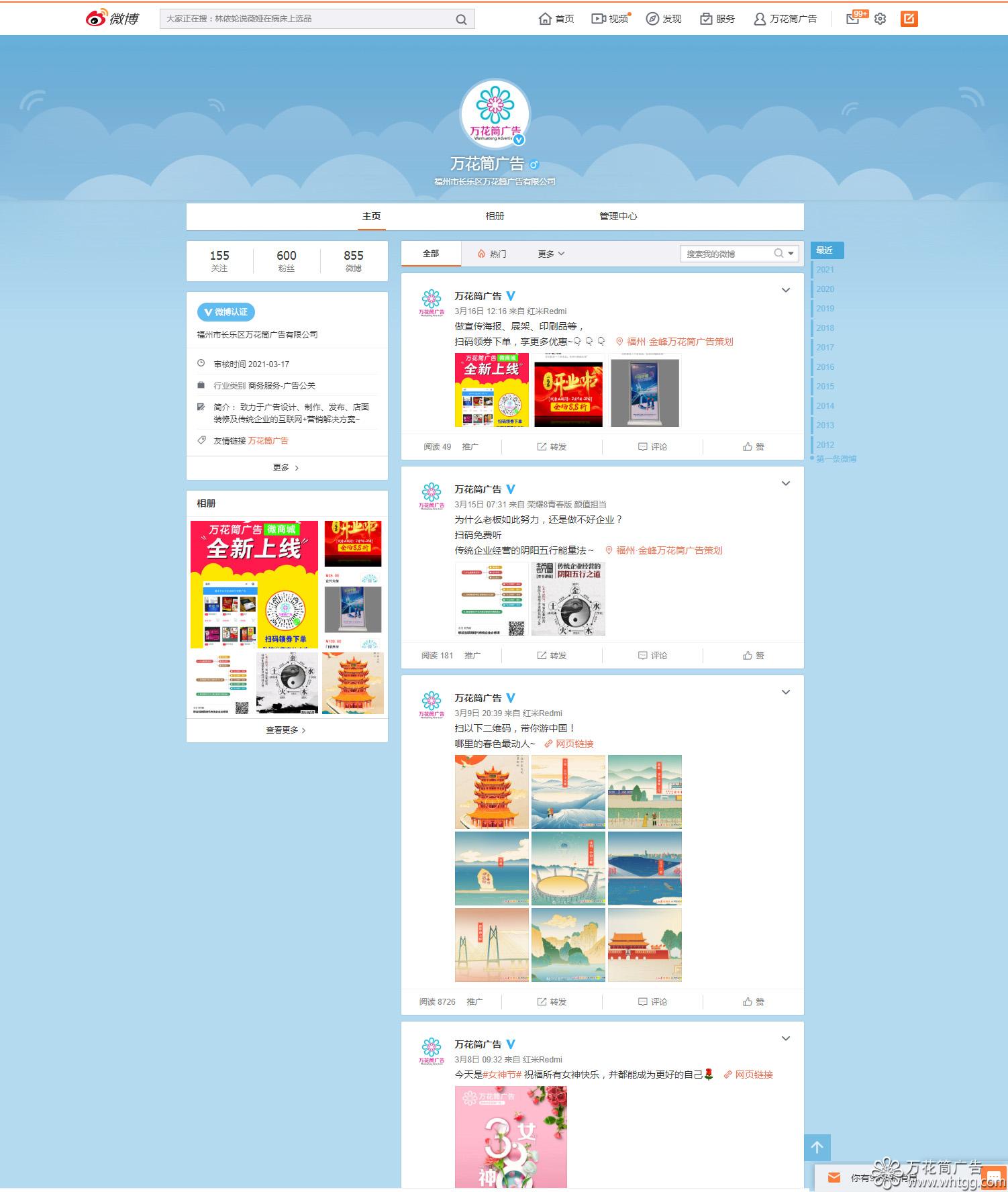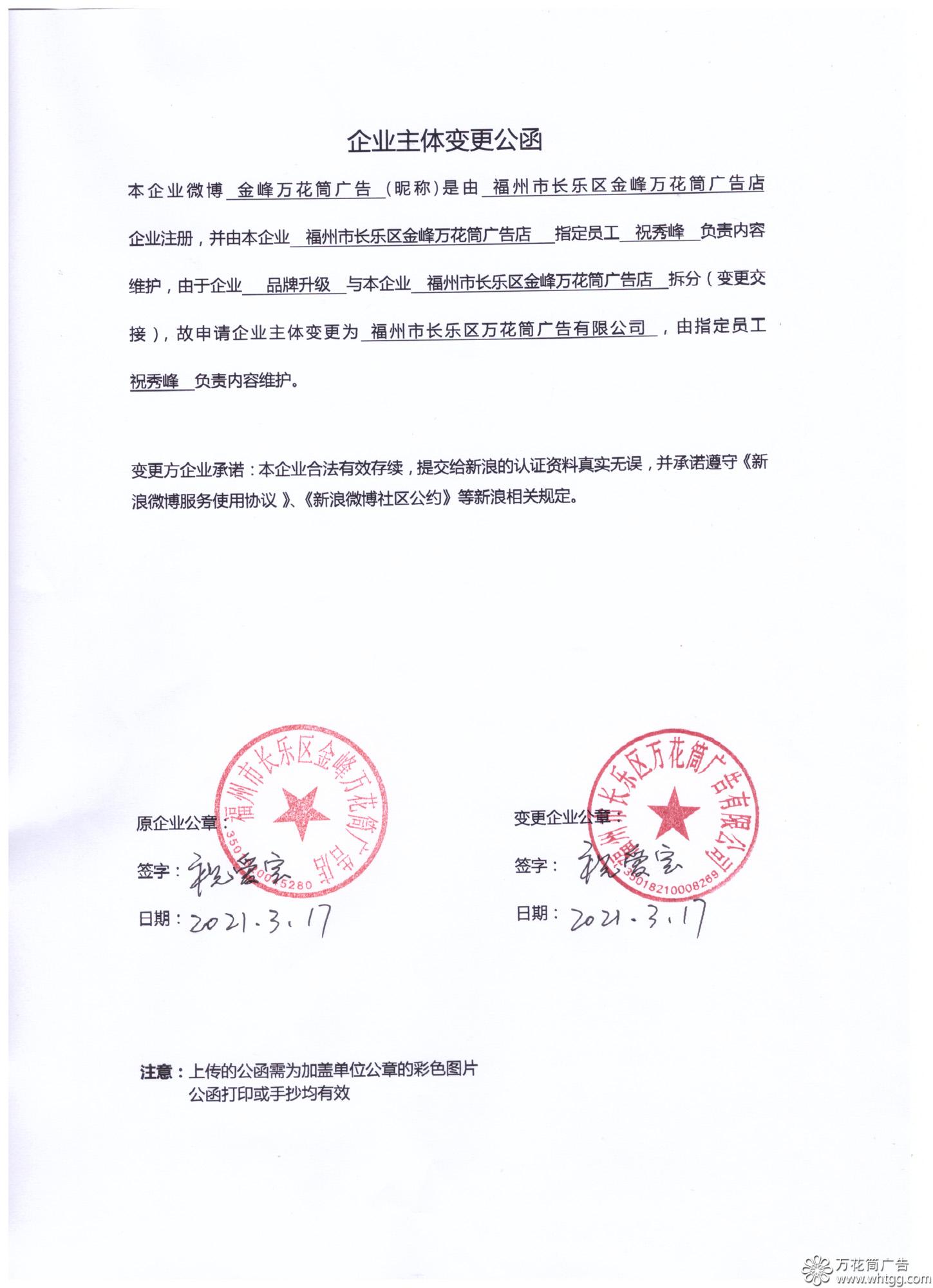 因品牌升級,故申請企業(yè)主體變更為:福州市長樂區(qū)萬花筒廣告有限公司,微博昵稱為:萬花筒廣告。